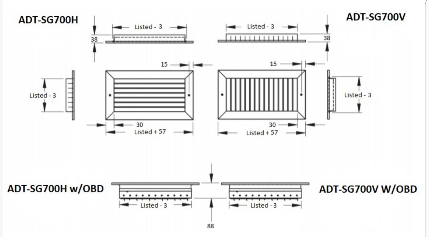 ADT-SG700H and ADT-SG700V single deflection supply grilles and registers are recommended for applications requiring pattern adjustability in a single horizontal or vertical plane, including sill, sidewall and down-throw (heating) applications.